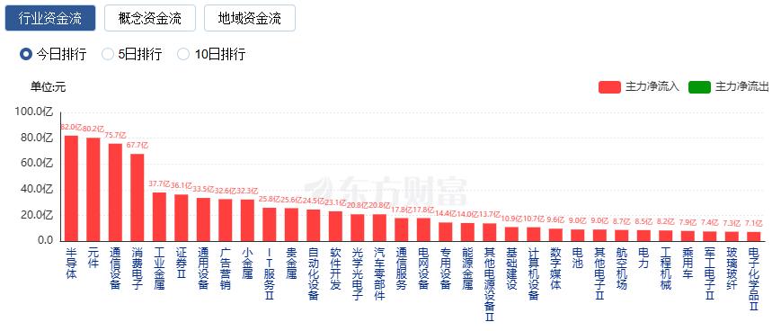 行业资金方面,截至收盘,半导体、元件、通信设备等净流入排名靠前,其中半导体净流入81.95亿。
