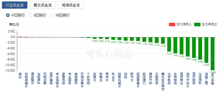 净流出方面,多元金融、油服工程、化学原料等净流出排名靠前,其中多元金融净流出11.83亿元。